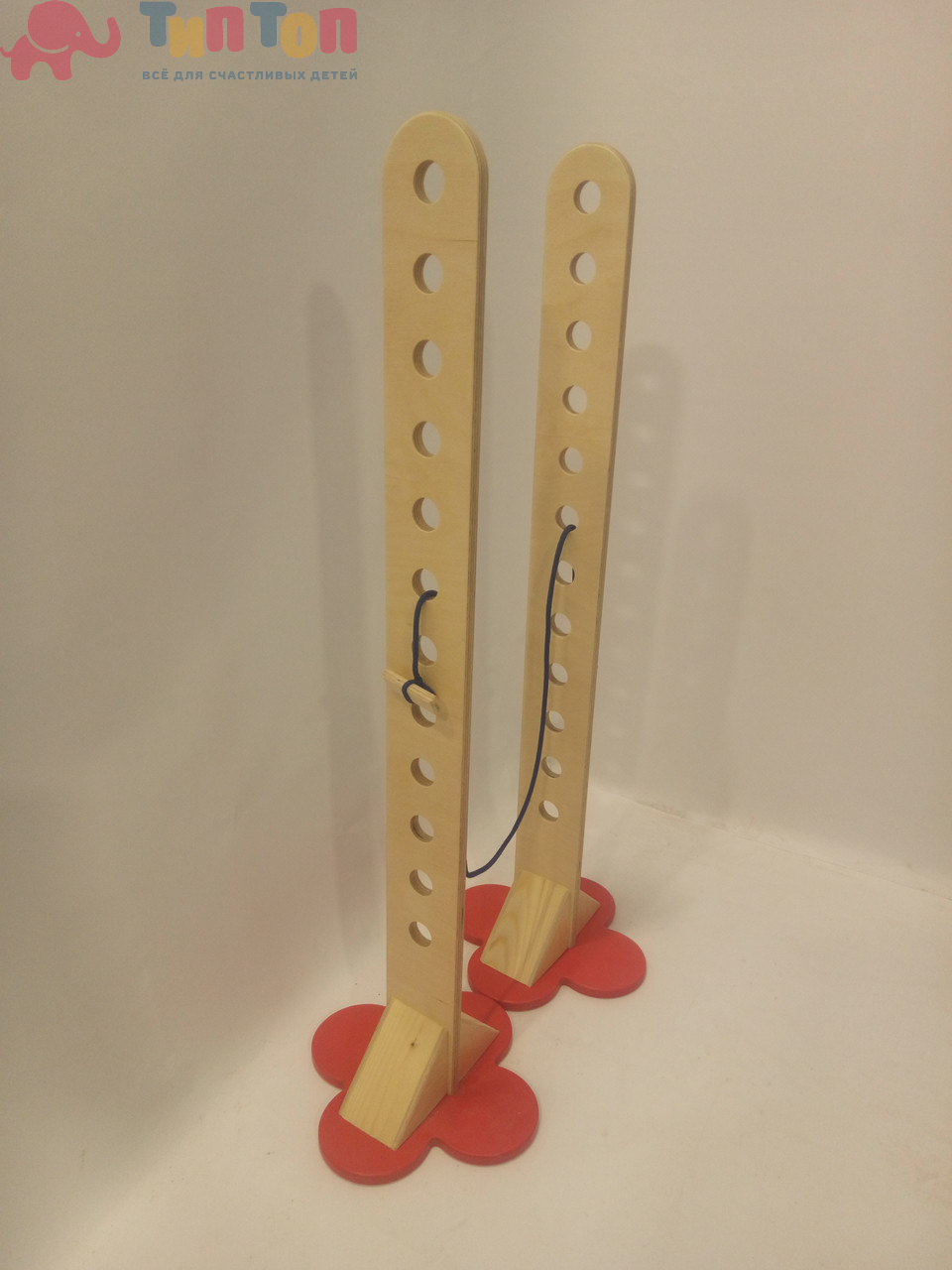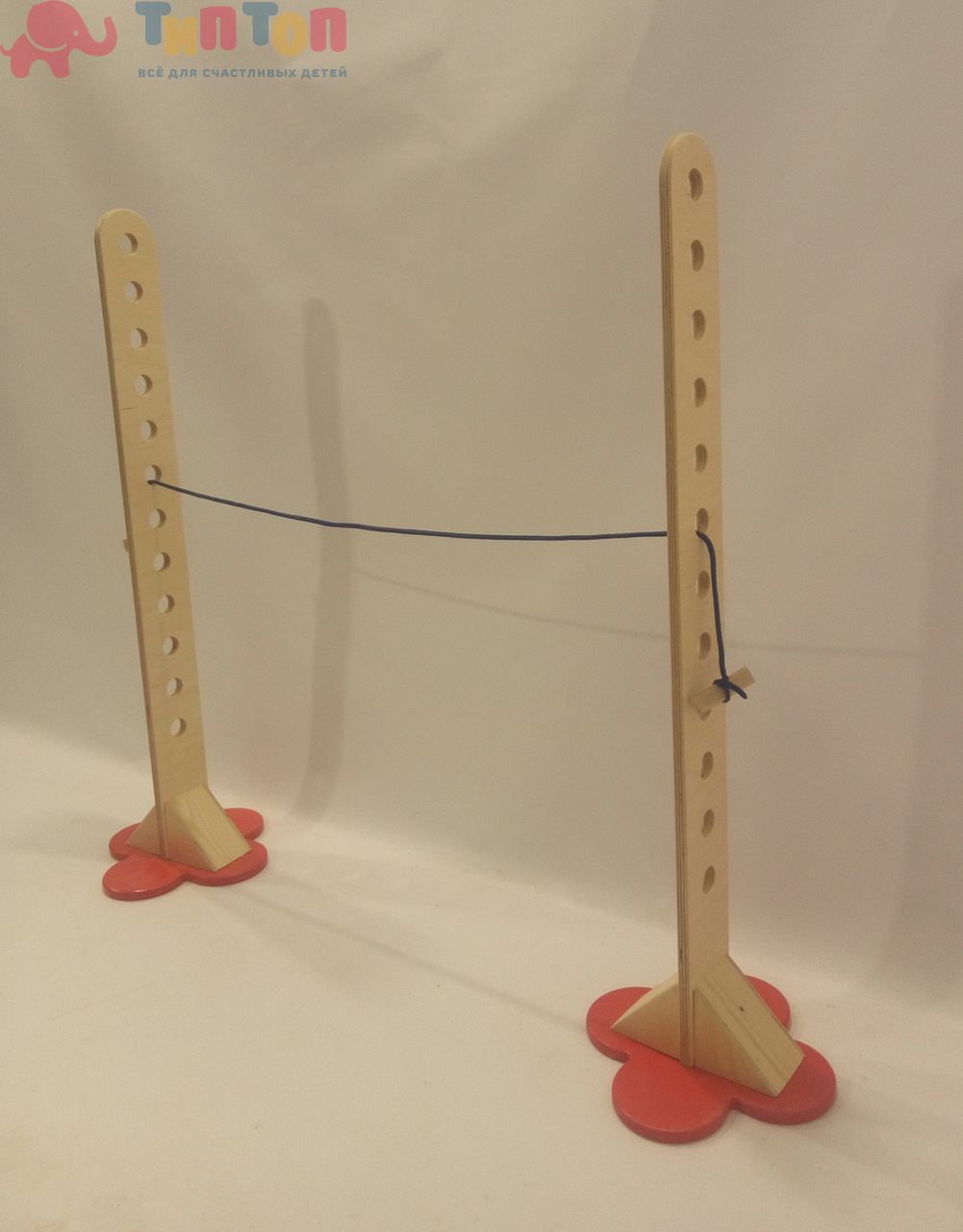 Сборная конструкция, состоящая из двух вертикальных стоек с горизонтальной веревкой яркого цвета длиной 3 м (заменяет жесткую планку). Стойка выполнена из фанеры, покрытие лак. На стойке 12 вертикальных отверстий для перестановки веревки.