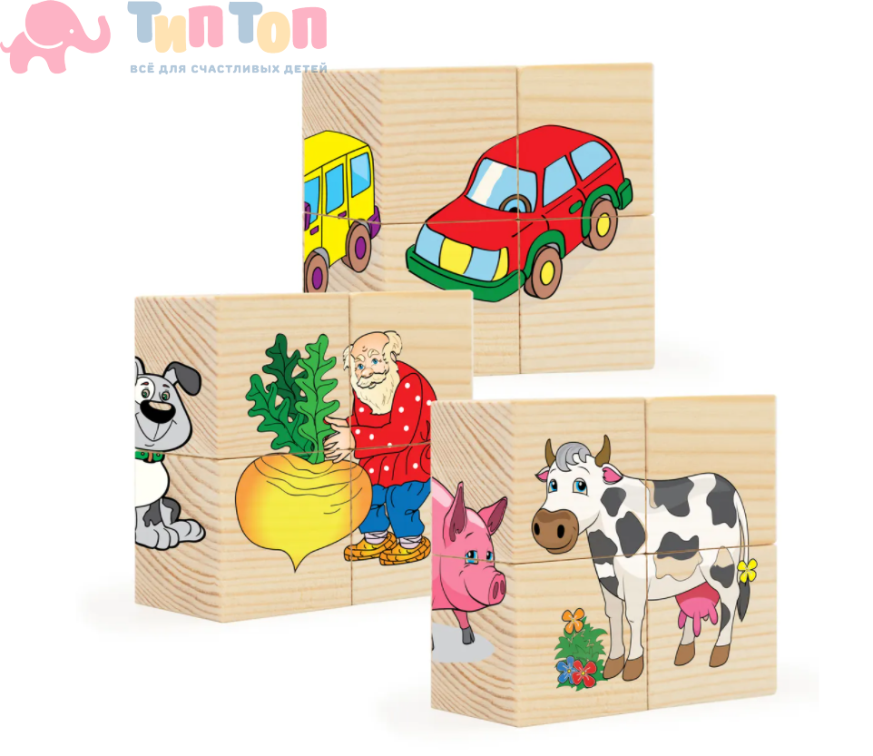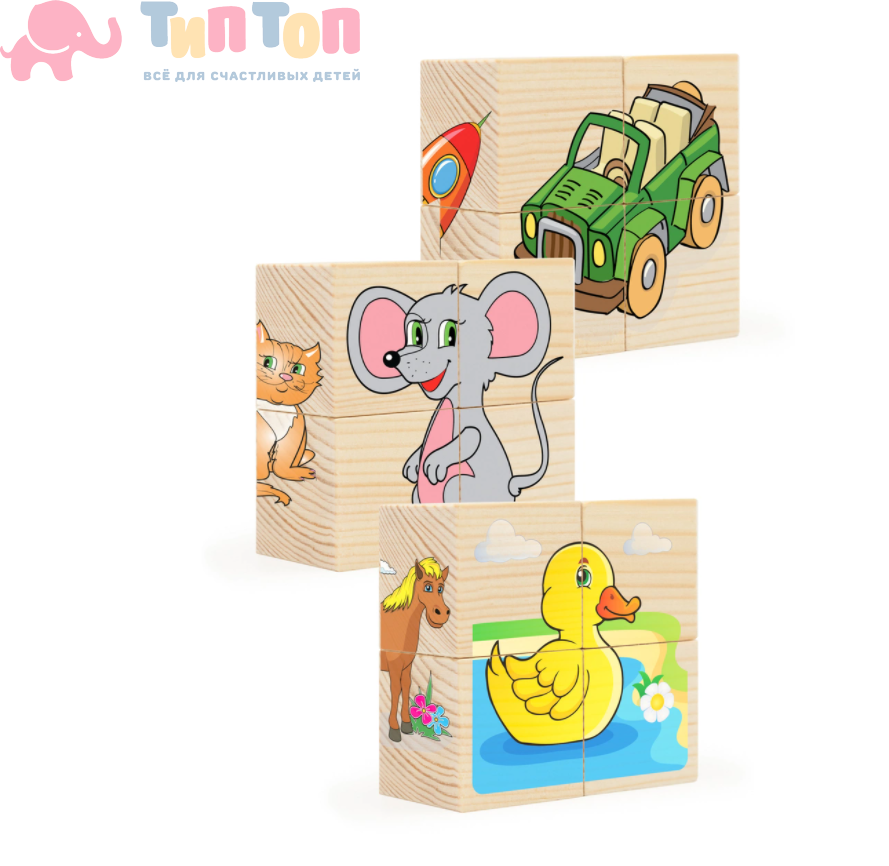 Помните, что кубики на первый взгляд кажутся простой и понятной игрушкой, но их потенциал огромен. Детские кубики издавна считаются одной из самых первых и самых лучших развивающих игрушек для маленьких детей. Кубики из дерева - казалось бы, что может быть проще, но как много интересных занятий можно придумать с ними! Можно построить домик или пирамидку, из серии «Кубики-пазл» можно составить картинку из частей. Объясните ребенку, что на каждой грани кубика нанесена часть картинки, а если 4 картинки собрать вместе, получится изображение.